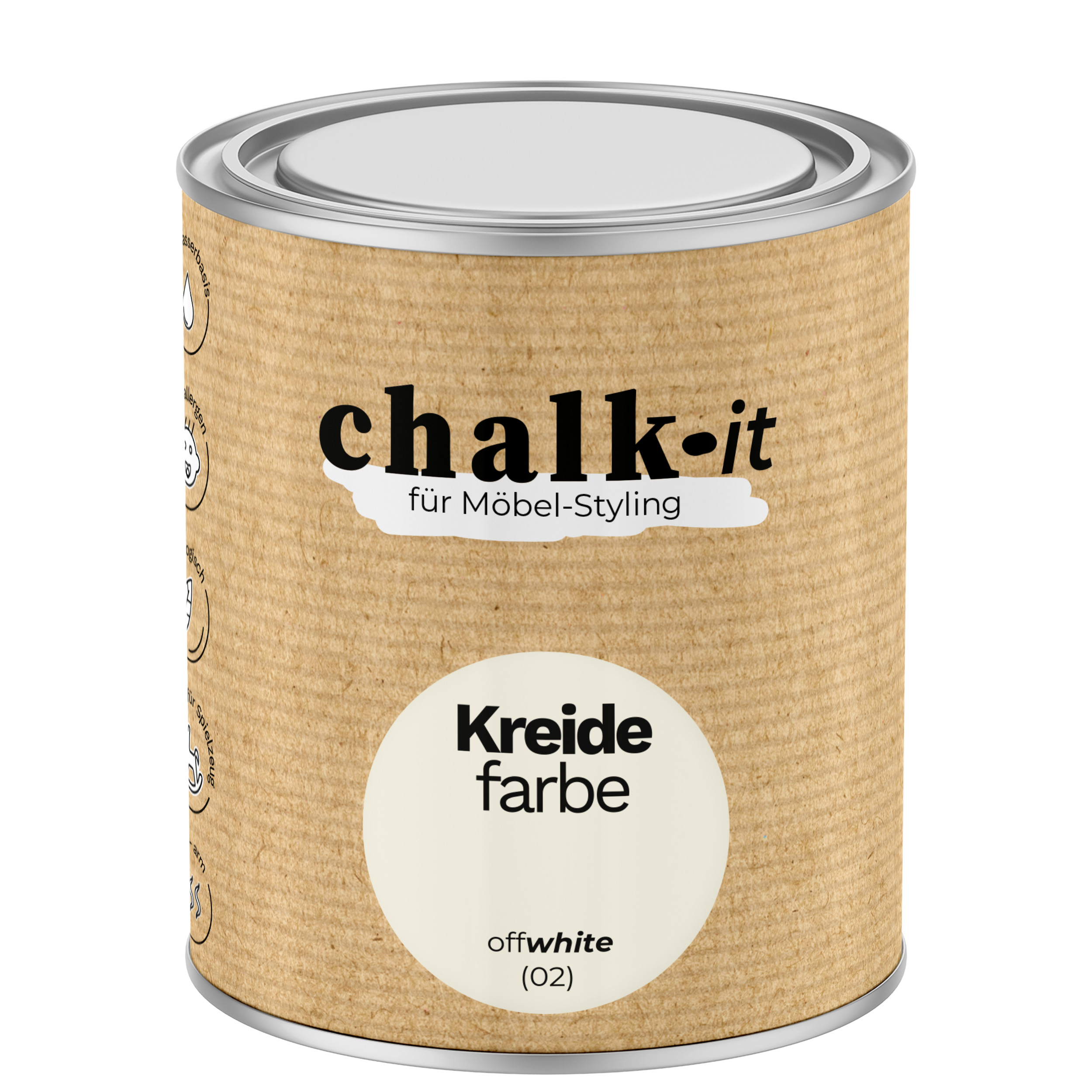 Farba kredowa Chalk-it jest to najwyższej jakości praktycznie bezwonna farba kredowa przeznaczona do stylizacji i renowacji mebli, zabawek oraz innych elementów dekoracyjnych i wystroju wnętrz. Farba kredowa Chalk-it może być bezpiecznie stosowana na meblach i zabawkach dla dzieci. Jest hipoalergiczna – co zostało potwierdzone certyfikatem laboratorium testującego kosmetyki i chemię gospodarczą. Farba kredowa Chalk-it charakteryzuje się matową powierzchnią, bardzo dobrą przyczepnością do podłoża i szybkim schnięciem. Oferuje nieograniczone możliwości dekoracyjne, od gładkiej powierzchni po Shabby Chic. Dzięki farbie kredowej Chalk-it przekształcenie ulubionego mebla jest bardzo łatwe i nie wymaga wiele pracy. Chalk-it nadaje się do: drewna, PVC, MDF, metalu, szkła, kamienia, cegły i wielu innych powierzchni. Farba kredowa Chalk-it zawiera najwyższej jakości pigmenty i do 45% kredy. Zapewnia to doskonałe krycie i ultra-matowe wykończenie. Po nałożeniu wosku Chalk-it na kolorową powłokę uzyskuje się aksamitną, lekko błyszczącą powierzchnię, która jest również dobrze zabezpieczona. Farba kredowa Chalk-it jest dostępna w szerokiej gamie kolorów, które można dodatkowo rozjaśnić (dodając Purewhite) lub przyciemnić (dodając Graphite). Farby kredowe Chalk-it można mieszać ze sobą, aby stworzyć własny, niepowtarzalny kolor i styl.