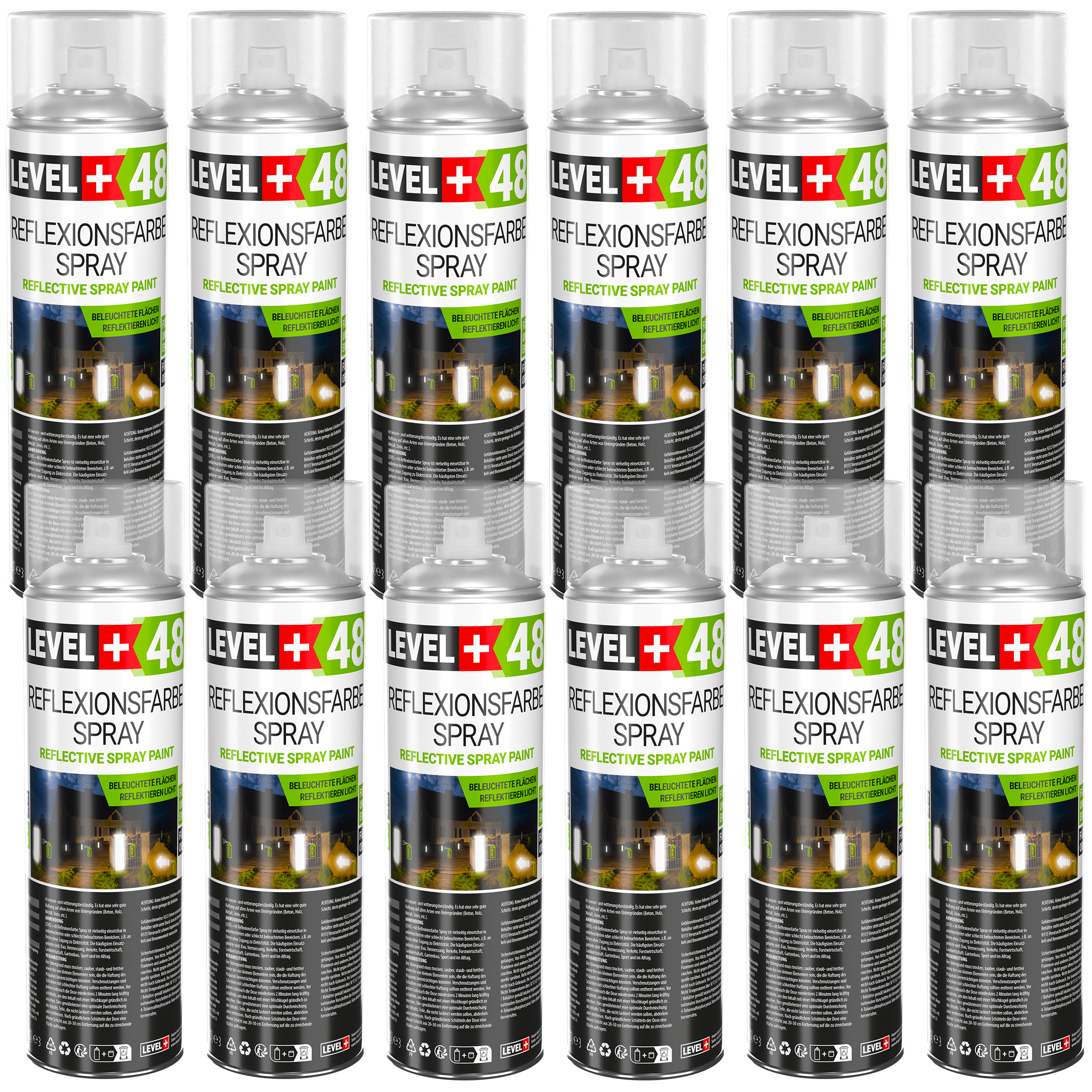 LEVEL+48 Reflexionfarbe Spray to odbijająca światło farba w sprayu zapewniająca bardzo dobrą widoczność w ciemności lub w miejscach słabo doświetlonych. Zastosowanie LEVEL+48 Spray sprawia, że spryskane obiekty oświetlone światłem w ciemności są wyraźnie widoczne. Jeśli na powierzchnię spryskaną sprayem odbijającym światło LEVEL+48 Spray padnie wiązka światła, odbije ona światło w tym samym kierunku, co źródło światła. Jeżeli powierzchnia na której naniesiono spray nie zostanie oświetlona obiekt nie będzie widoczny. LEVEL+48 Spray jest trwały i przeznaczony do ciągłego użytku. Jest odporny na działanie wody i warunków atmosferycznych. Charakteryzuje się bardzo dobrą przyczepnością do wszelkiego rodzaju podłoży (beton, drewno, metal, kamień itp.).