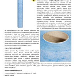 Matę uszczelniającą HALBAU HP1200 przed montażem należy dokładnie wymierzyć i przyciąć nożem lub nożyczkami na arkusze o odpowiednio wymierzonej długości dostosowanej do wymiarów uszczelnianej powierzchni. Należy uwzględnić wszelkie szczeliny dylatacyjne oraz przejścia rurowe. Na podłoże należy nanieść klej cementowy klasy C2 i rozprowadzić go za pomocą stalowej pacy zębatej (4×4 mm). Klej rozprowadzamy na pasie odpowiadającym szerokości maty. Po nałożeniu kleju należy przyłożyć i dokładnie docisnąć matę do uszczelnianego podłoża za pomocą gładkiej strony pacy lub wałka. Matę należy tak zamontować (wygładzać) aby nie pozostawały pod jej powierzchnią puste przestrzenie. Montaż należy wykonać w taki sposób, aby nie doprowadzić do zabrudzenia powierzchni maty klejem. Łączenie arkuszy maty miedzy sobą można wykonać na dwa sposoby: metodą „na styk”, lub metodą „na zakład”. Metoda łączenia „na styk”: Matę mocować tak, aby jej arkusze stykały się ze sobą brzegami. Na styku miedzy arkuszami wklejamy centralnie taśmę uszczelniającą HALBAU HN04 o szerokości minimum 120mm, przyklejając ją całą powierzchnią za pomocą polimerowej lub polimerowo-cementowej zaprawy uszczelniającej. Taśma powinna być przyklejona centralnie i równo na całej długości styku arkuszy. Metoda łączenia „na zakład”: Matę mocować tak, aby jej arkusze nachodziły na siebie pasami o minimalnej szerokości 5cm. Stykające się ze sobą arkusze maty – jej zakład sklejamy ze sobą za pomocą polimerowej lub polimerowo-cementowej zaprawy uszczelniającej. Po wykonaniu łączeń między arkuszami należy przystąpić do uszczelniania szczelin dylatacjnych (np. konstrukcyjnych, przeciwskurczowych, brzegowych), styków poszczególnych płaszczyzn (ściana i podłoga) oraz uszczelniania przejść rurowych. W tym celu należy użyć sznurów dylatacyjnych oraz taśm, narożników i mankietów uszczelniających HALBAU. Po zamontowaniu maty uszczelniającej rozpoczynamy montaż narożników oraz mankietów uszczelniających ściennych i podłogowych. Po ich wstępnym ustawieniu odmierzamy dalsze proste odcinki taśmy pamiętając o doliczeniu zakładów o długości minimum 40 mm na połączeniach taśm oraz taśm z narożnikami. Na powierzchni przeznaczonej do montażu taśm układamy cienką warstwę masy hydroizolacyjnej, na którą układamy narożniki i proste odcinki taśmy, dbając o ich równe ustawienie. Po ułożeniu taśmy dociskamy ją od góry miękkim wałkiem szpachelką lub kielnią do podłoża i dodatkowo szpachlujemy masą uszczelniającą od góry. Należy pamiętać o dokładnym połączeniu (za pomocą masy uszczelniającej) taśm między sobą oraz taśm z narożnikami. UWAGA: Wklejając taśmy i narożniki, należy zadbać o to, aby nie pokrywać masą uszczelniającą środkowej części (około 20 mm) taśmy oraz tej samej szerokości podłoża pod nią. Tak zamontowaną taśmę szpachlujemy masą hydroizolacyjną po obu stronach, w minimum dwóch warstwach, pozostawiając niezaszpachlowaną środkową część taśmy (minimum 20 mm). Uszczelniając przejścia dylatacyjne z użyciem wypełnienia w postaci sznurów dylatacyjnych, należy użyć sznura o odpowiedniej średnicy, który będzie szczelnie wypełniać całą szczelinę dylatacyjną i idealnie dociskać taśmę do ścian wewnątrz. UWAGA! Montując taśmy i narożniki bezwzględnie zabrania się używania ostrych narzędzi. Dalsze prace budowlane należy prowadzić po wyschnięciu masy uszczelniającej.