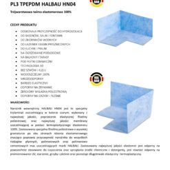Narożnik wewnętrzny HALBAU HN04 jest to specjalny trylaminat uszczelniający w kolorze szarym, wykonany z najwyższej jakości, poprzecznie elastycznej flizeliny poliestrowej oraz najwyższej jakości membrany uszczelniającej w postaci termoplastycznego elastomeru 100%. Zastosowana specjalna flizelina poliestrowa o wysokiej gramaturze po obu stronach rdzenia elastomerowego znacząco poprawia przyczepność narożnika do wszystkich rodzajów płynnych, polimerowych oraz polimerowo cementowych mas uszczelniających marki HALBAU. Zastosowany najwyższej jakości elastomer jest odporny na powszechnie stosowane do czyszczenia oraz sprzątania środki chemiczne i detergenty, jest również odporny na promieniowanie UV, starzenie, grzyby i pleśnie oraz pozostaje długotrwale elastyczny i termoplastyczny.