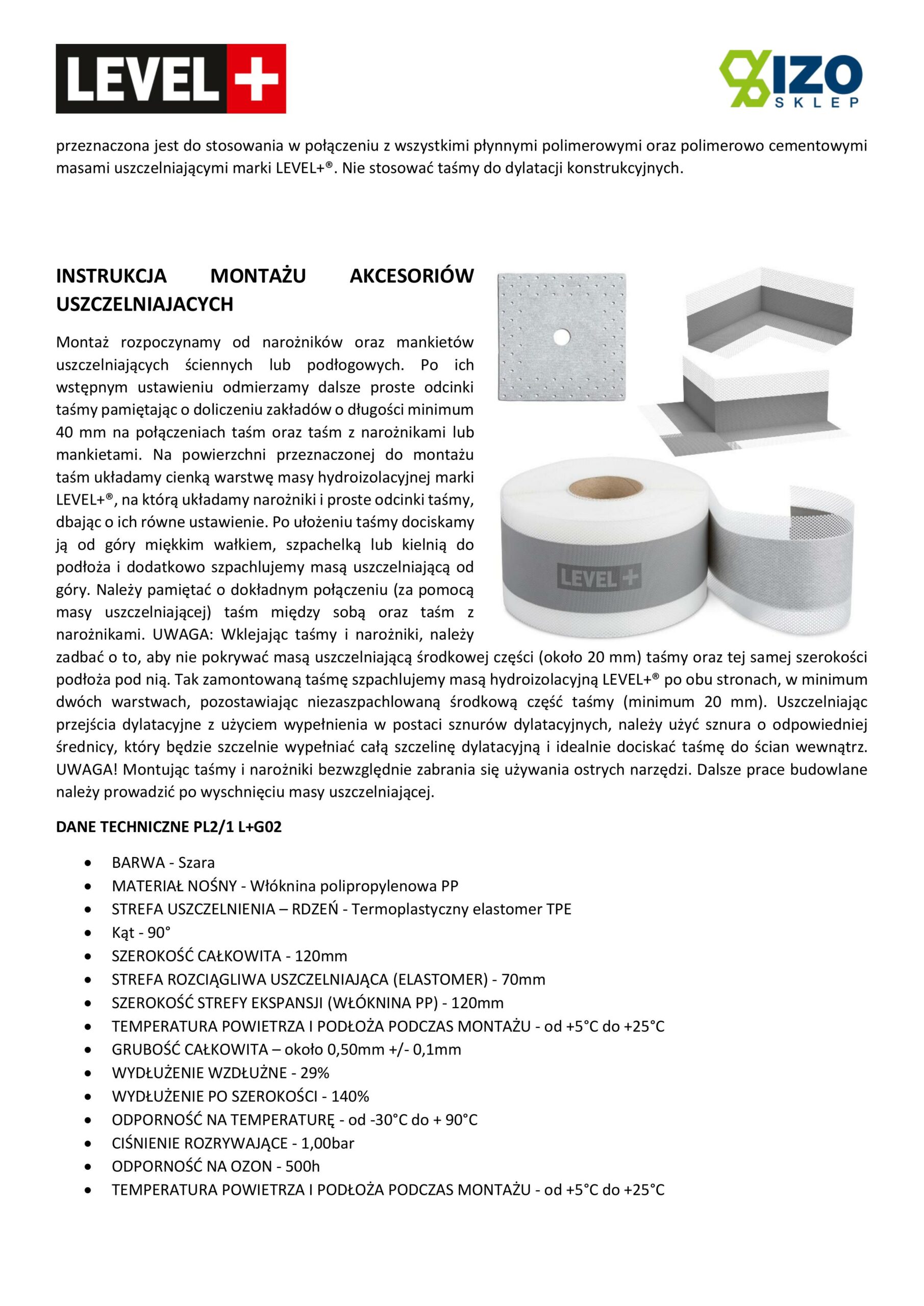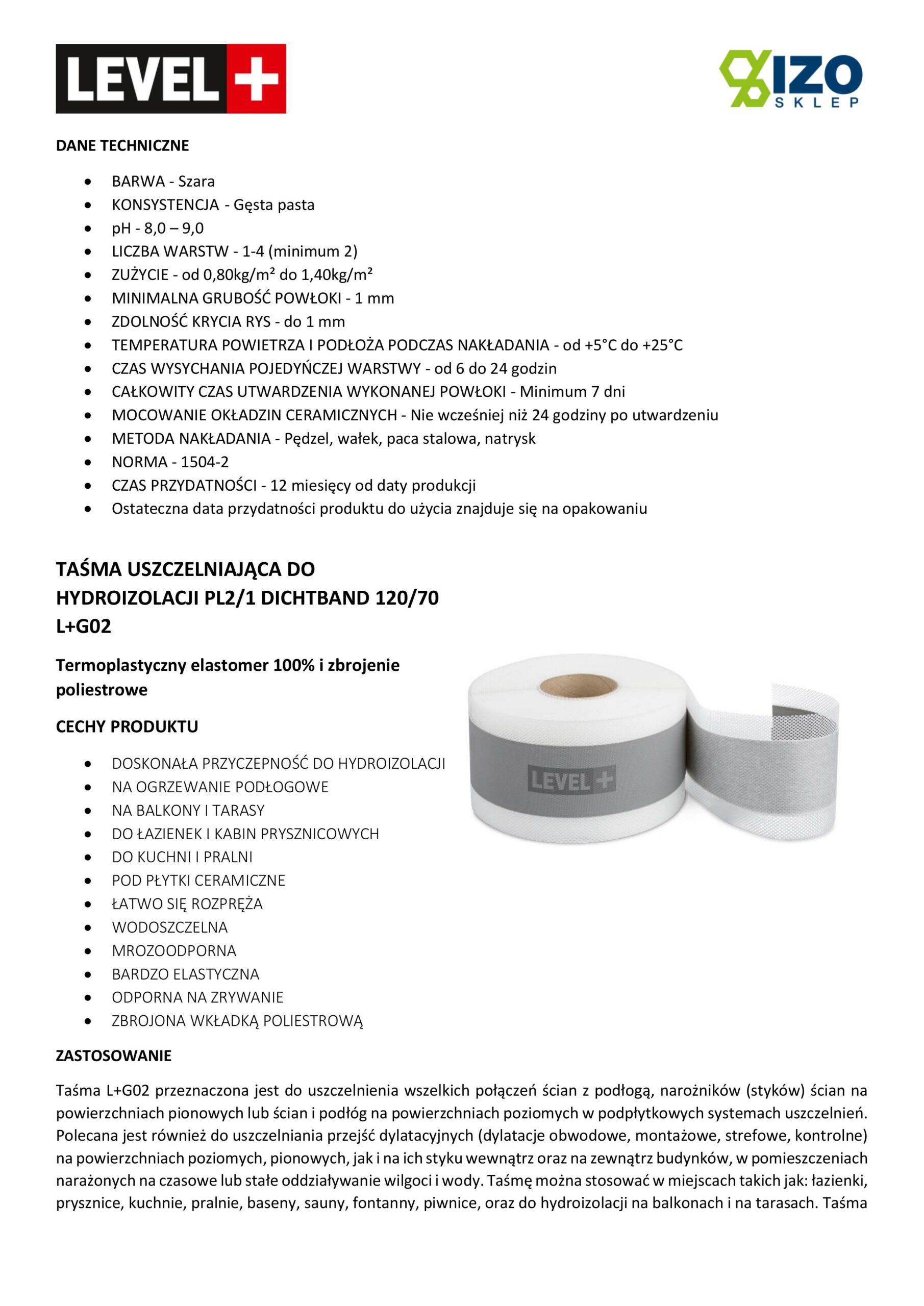 Taśma L+G02 przeznaczona jest do uszczelnienia wszelkich połączeń ścian z podłogą, narożników (styków) ścian na powierzchniach pionowych lub ścian i podłóg na powierzchniach poziomych w podpłytkowych systemach uszczelnień. Polecana jest również do uszczelniania przejść dylatacyjnych (dylatacje obwodowe, montażowe, strefowe, kontrolne) na powierzchniach poziomych, pionowych, jak i na ich styku wewnątrz oraz na zewnątrz budynków, w pomieszczeniach narażonych na czasowe lub stałe oddziaływanie wilgoci i wody. Taśmę można stosować w miejscach takich jak: łazienki, prysznice, kuchnie, pralnie, baseny, sauny, fontanny, piwnice, oraz do hydroizolacji na balkonach i na tarasach. Taśma przeznaczona jest do stosowania w połączeniu z wszystkimi płynnymi polimerowymi oraz polimerowo cementowymi masami uszczelniającymi marki LEVEL+®. Nie stosować taśmy do dylatacji konstrukcyjnych.