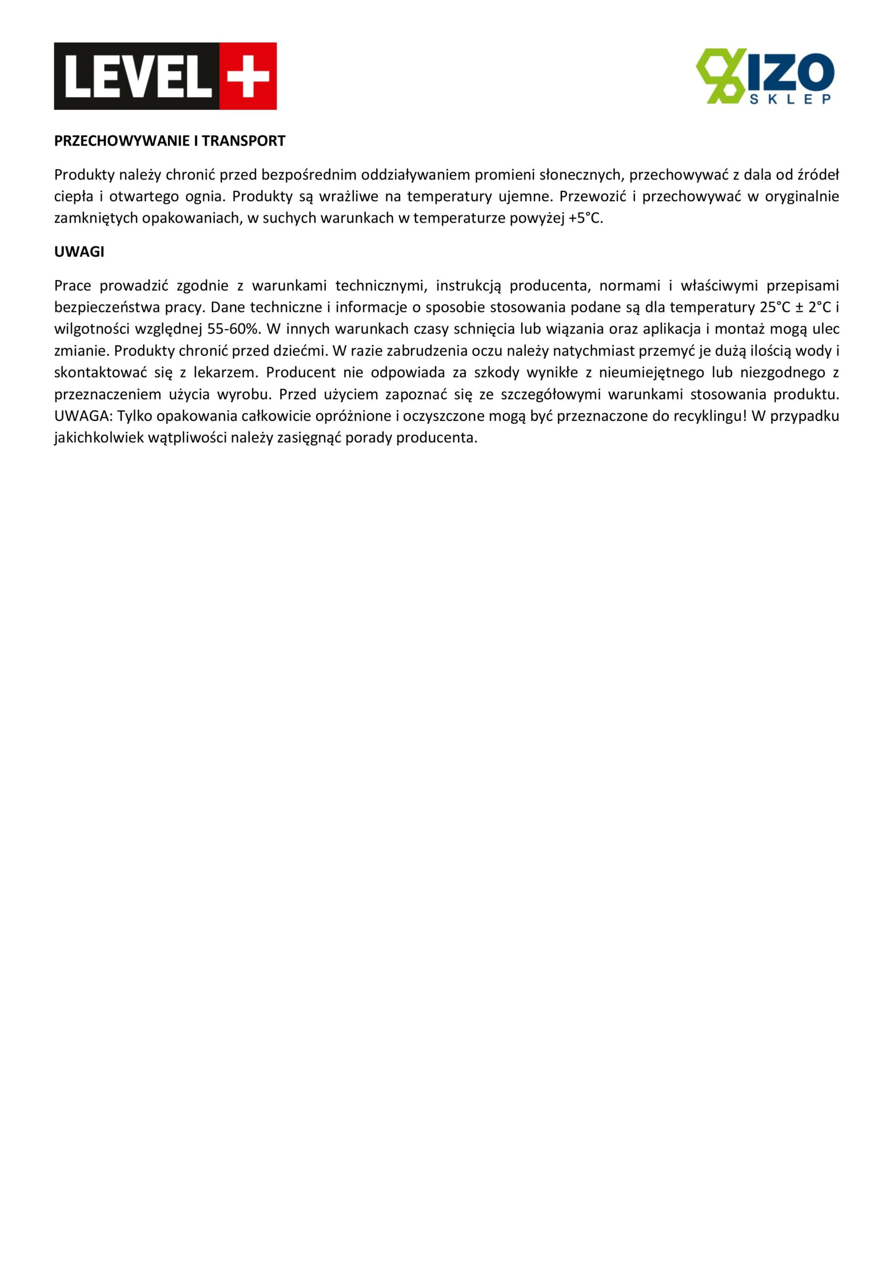 Prace prowadzić zgodnie z warunkami technicznymi, instrukcją producenta, normami i właściwymi przepisami bezpieczeństwa pracy. Dane techniczne i informacje o sposobie stosowania podane są dla temperatury 25°C ± 2°C i wilgotności względnej 55-60%. W innych warunkach czasy schnięcia lub wiązania oraz aplikacja i montaż mogą ulec zmianie. Produkty chronić przed dziećmi. W razie zabrudzenia oczu należy natychmiast przemyć je dużą ilością wody i skontaktować się z lekarzem. Producent nie odpowiada za szkody wynikłe z nieumiejętnego lub niezgodnego z przeznaczeniem użycia wyrobu. Przed użyciem zapoznać się ze szczegółowymi warunkami stosowania produktu. UWAGA: Tylko opakowania całkowicie opróżnione i oczyszczone mogą być przeznaczone do recyklingu! W przypadku jakichkolwiek wątpliwości należy zasięgnąć porady producenta.