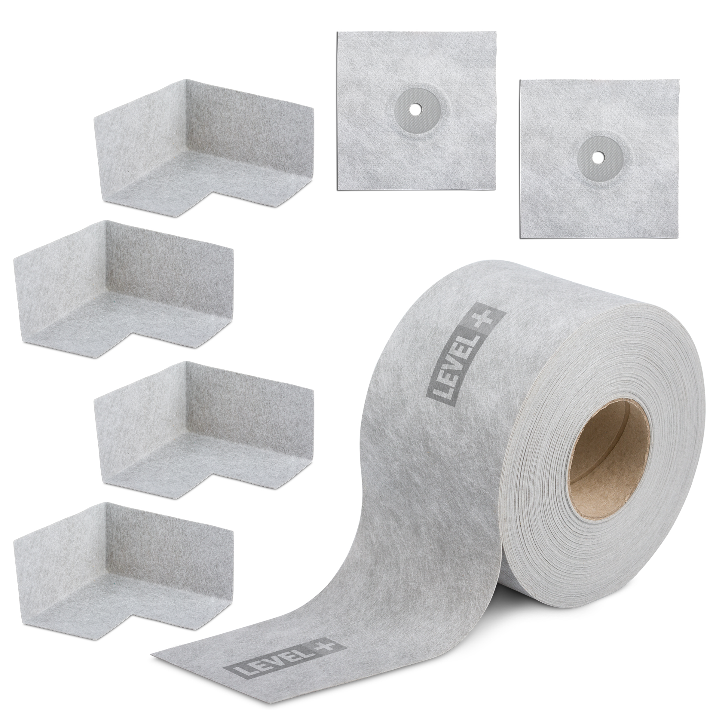 Montaż rozpoczynamy od narożników oraz mankietów uszczelniających ściennych lub podłogowych. Po ich wstępnym ustawieniu odmierzamy dalsze proste odcinki taśmy pamiętając o doliczeniu zakładów o długości minimum 40 mm na połączeniach taśm oraz taśm z narożnikami lub mankietami. Na powierzchni przeznaczonej do montażu taśm układamy cienką warstwę masy hydroizolacyjnej marki LEVEL+®, na którą układamy narożniki i proste odcinki taśmy, dbając o ich równe ustawienie. Po ułożeniu taśmy dociskamy ją od góry miękkim wałkiem, szpachelką lub kielnią do podłoża i dodatkowo szpachlujemy masą uszczelniającą od góry. Należy pamiętać o dokładnym połączeniu (za pomocą masy uszczelniającej) taśm między sobą oraz taśm z narożnikami. UWAGA: Wklejając taśmy i narożniki, należy zadbać o to, aby nie pokrywać masą uszczelniającą środkowej części (około 20 mm) taśmy oraz tej samej szerokości podłoża pod nią. Tak zamontowaną taśmę szpachlujemy masą hydroizolacyjną LEVEL+® po obu stronach, w minimum dwóch warstwach, pozostawiając niezaszpachlowaną środkową część taśmy (minimum 20 mm). Uszczelniając przejścia dylatacyjne z użyciem wypełnienia w postaci sznurów dylatacyjnych, należy użyć sznura o odpowiedniej średnicy, który będzie szczelnie wypełniać całą szczelinę dylatacyjną i idealnie dociskać taśmę do ścian wewnątrz. UWAGA! Montując taśmy i narożniki bezwzględnie zabrania się używania ostrych narzędzi. Dalsze prace budowlane należy prowadzić po wyschnięciu masy uszczelniającej.