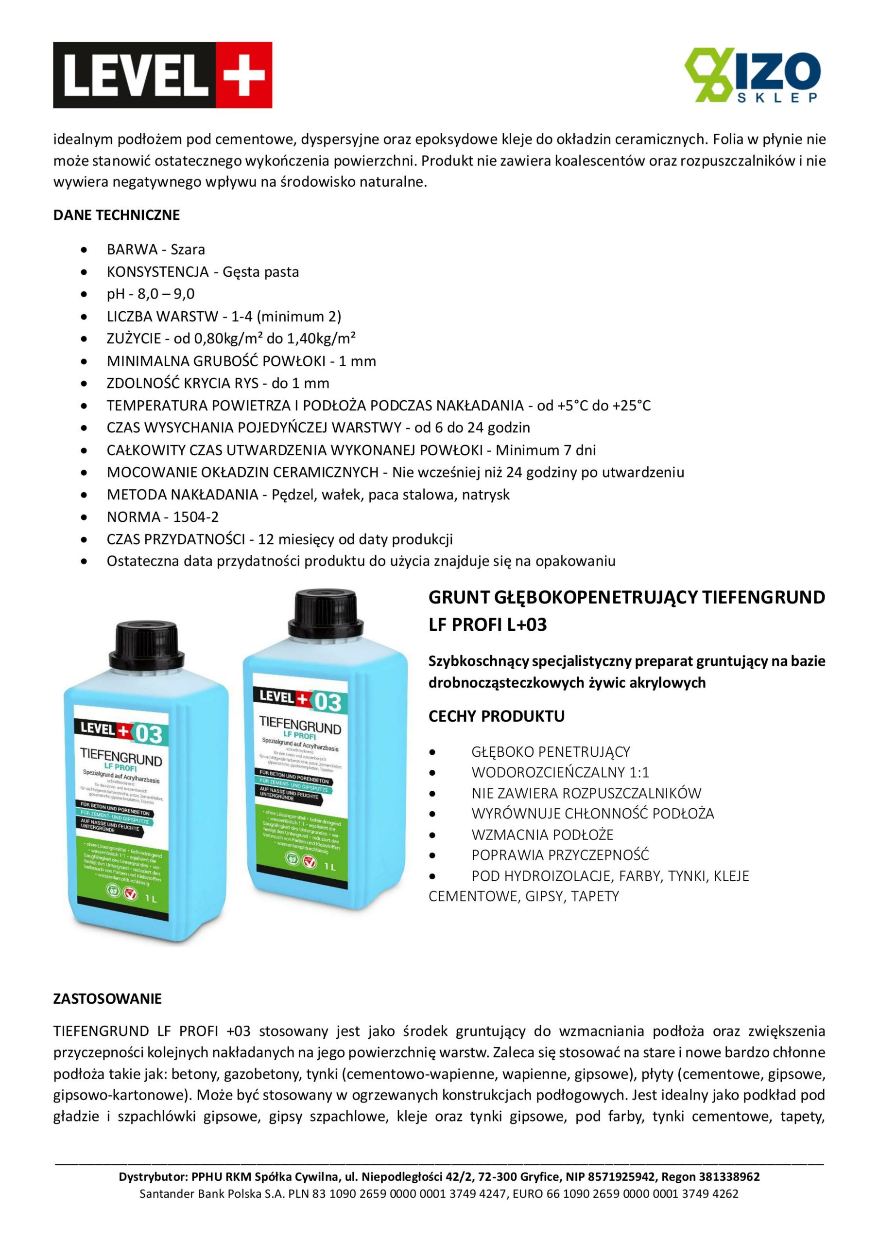 TIEFENGRUND LF PROFI +03 stosowany jest jako środek gruntujący do wzmacniania podłoża oraz zwiększenia przyczepności kolejnych nakładanych na jego powierzchnię warstw. Zaleca się stosować na stare i nowe bardzo chłonne podłoża takie jak: betony, gazobetony, tynki (cementowo-wapienne, wapienne, gipsowe), płyty (cementowe, gipsowe, gipsowo-kartonowe). Może być stosowany w ogrzewanych konstrukcjach podłogowych. Jest idealny jako podkład pod gładzie i szpachlówki gipsowe, gipsy szpachlowe, kleje oraz tynki gipsowe, pod farby, tynki cementowe, tapety, jastrychy, wylewki samopoziomujące. Można stosować pod polimerowe oraz polimerowo cementowe powłoki oraz membrany hydroizolacyjne. Pod kleje cementowe oraz dyspersyjne do płytek ceramicznych, wszelkiego rodzaju wyprawy tynkarskie akrylowe i mineralne. Produkt przeznaczony jest szczególnie jako warstwa gruntująca pod jedno i dwu komponentowe, polimerowe oraz polimerowo-cementowe powłoki – membrany hydroizolacyjne marki LEVEL PLUS. Można stosować na powierzchnie pionowe oraz poziome, wewnątrz oraz na zewnątrz pomieszczeń. W przypadku podłoży o zmniejszonej chłonności można rozcieńczyć z wodą w stosunku 1:1. Produkt nie zawiera koalescentów oraz rozpuszczalników. Po wyschnięciu praktycznie nie tworzy powłoki, powoduje hydrofobizację podłoża. Produkt paroprzepuszczalny. Nie wywiera negatywnego wpływu na środowisko naturalne.