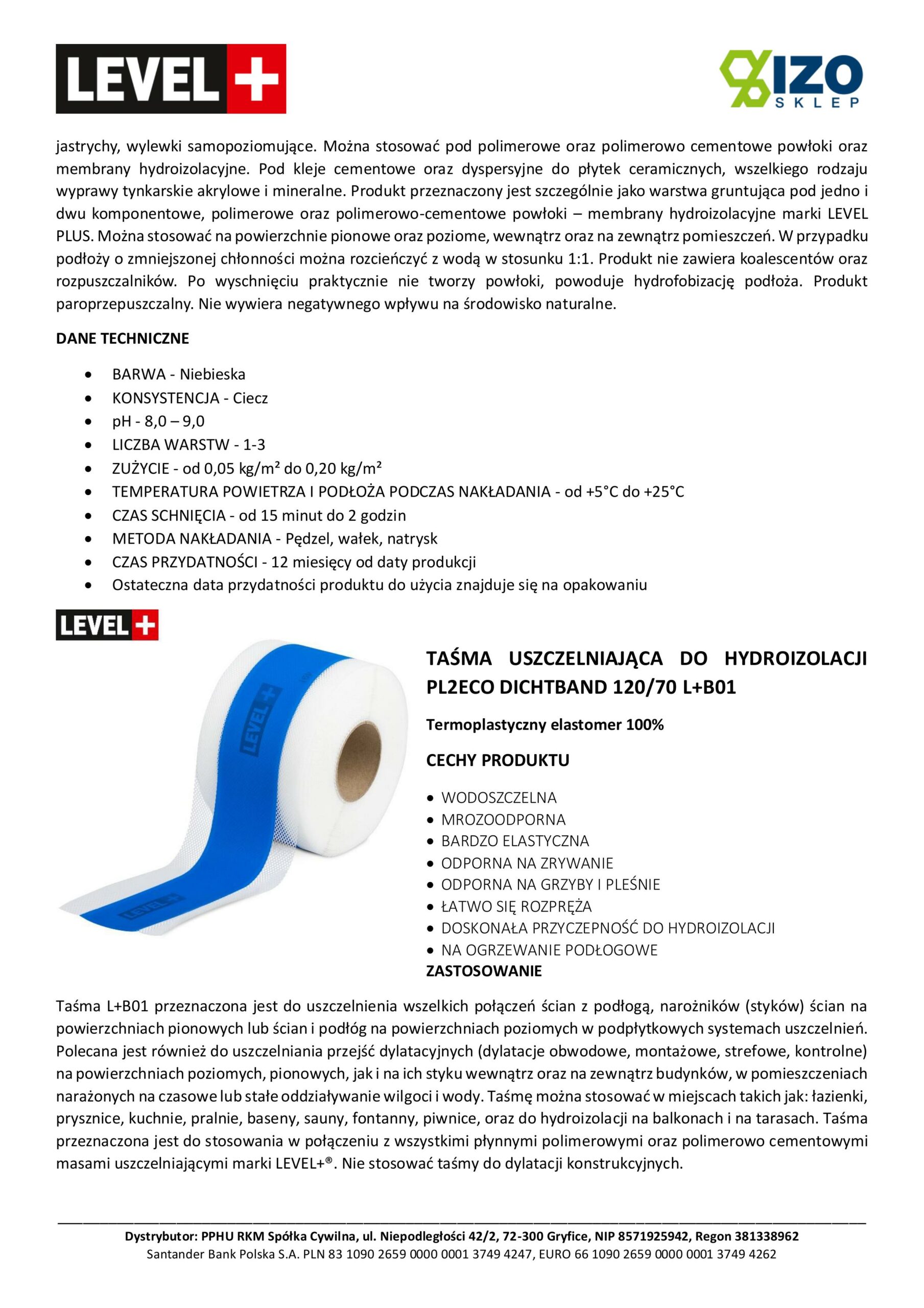 Taśma L+B01 przeznaczona jest do uszczelnienia wszelkich połączeń ścian z podłogą, narożników (styków) ścian na powierzchniach pionowych lub ścian i podłóg na powierzchniach poziomych w podpłytkowych systemach uszczelnień. Polecana jest również do uszczelniania przejść dylatacyjnych (dylatacje obwodowe, montażowe, strefowe, kontrolne) na powierzchniach poziomych, pionowych, jak i na ich styku wewnątrz oraz na zewnątrz budynków, w pomieszczeniach narażonych na czasowe lub stałe oddziaływanie wilgoci i wody. Taśmę można stosować w miejscach takich jak: łazienki, prysznice, kuchnie, pralnie, baseny, sauny, fontanny, piwnice, oraz do hydroizolacji na balkonach i na tarasach. Taśma przeznaczona jest do stosowania w połączeniu z wszystkimi płynnymi polimerowymi oraz polimerowo cementowymi masami uszczelniającymi marki LEVEL+®. Nie stosować taśmy do dylatacji konstrukcyjnych.
