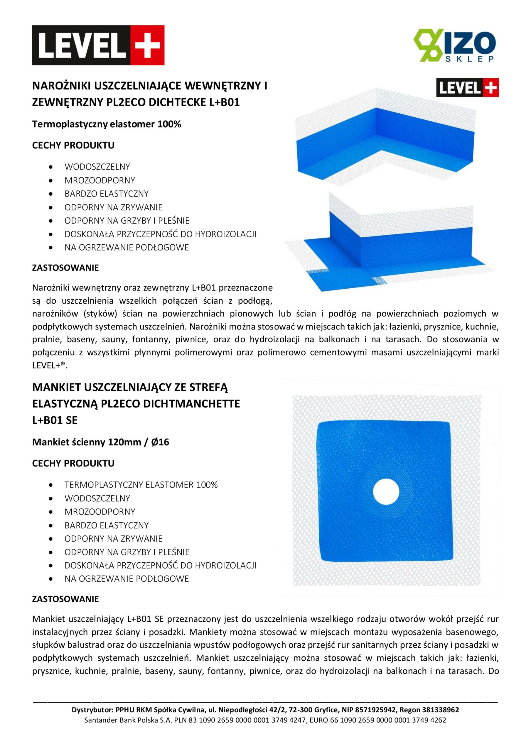 Mankiet uszczelniający L+B01 SE przeznaczony jest do uszczelnienia wszelkiego rodzaju otworów wokół przejść rur instalacyjnych przez ściany i posadzki. Mankiety można stosować w miejscach montażu wyposażenia basenowego, słupków balustrad oraz do uszczelniania wpustów podłogowych oraz przejść rur sanitarnych przez ściany i posadzki w podpłytkowych systemach uszczelnień. Mankiet uszczelniający można stosować w miejscach takich jak: łazienki, prysznice, kuchnie, pralnie, baseny, sauny, fontanny, piwnice, oraz do hydroizolacji na balkonach i na tarasach. Do stosowania w połączeniu z wszystkimi płynnymi polimerowymi oraz polimerowo cementowymi masami uszczelniającymi marki LEVEL+®.