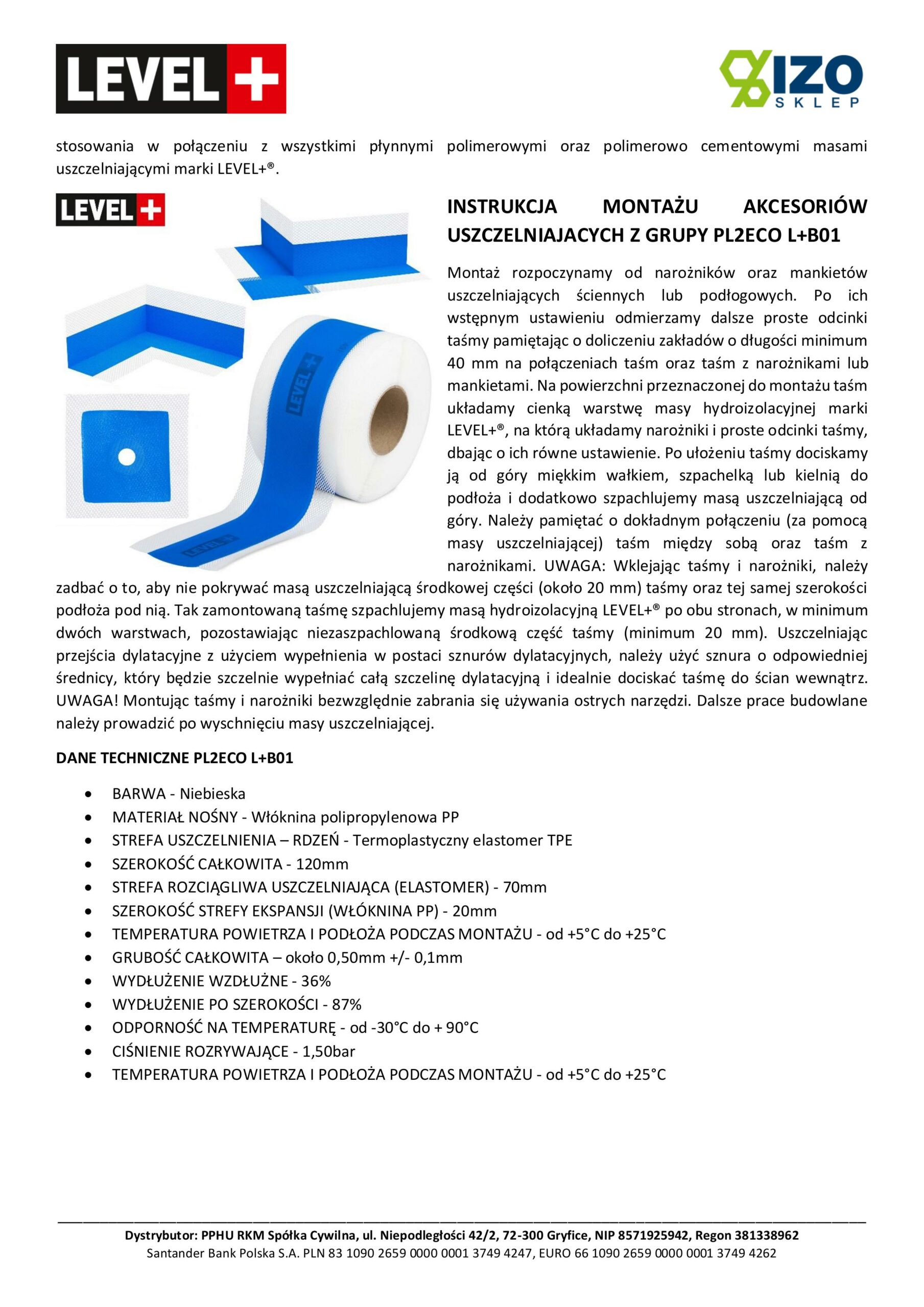 Montaż rozpoczynamy od narożników oraz mankietów uszczelniających ściennych lub podłogowych. Po ich wstępnym ustawieniu odmierzamy dalsze proste odcinki taśmy pamiętając o doliczeniu zakładów o długości minimum 40 mm na połączeniach taśm oraz taśm z narożnikami lub mankietami. Na powierzchni przeznaczonej do montażu taśm układamy cienką warstwę masy hydroizolacyjnej marki LEVEL+®, na którą układamy narożniki i proste odcinki taśmy, dbając o ich równe ustawienie. Po ułożeniu taśmy dociskamy ją od góry miękkim wałkiem, szpachelką lub kielnią do podłoża i dodatkowo szpachlujemy masą uszczelniającą od góry. Należy pamiętać o dokładnym połączeniu (za pomocą masy uszczelniającej) taśm między sobą oraz taśm z narożnikami. UWAGA: Wklejając taśmy i narożniki, należy zadbać o to, aby nie pokrywać masą uszczelniającą środkowej części (około 20 mm) taśmy oraz tej samej szerokości podłoża pod nią. Tak zamontowaną taśmę szpachlujemy masą hydroizolacyjną LEVEL+® po obu stronach, w minimum dwóch warstwach, pozostawiając niezaszpachlowaną środkową część taśmy (minimum 20 mm). Uszczelniając przejścia dylatacyjne z użyciem wypełnienia w postaci sznurów dylatacyjnych, należy użyć sznura o odpowiedniej średnicy, który będzie szczelnie wypełniać całą szczelinę dylatacyjną i idealnie dociskać taśmę do ścian wewnątrz. UWAGA! Montując taśmy i narożniki bezwzględnie zabrania się używania ostrych narzędzi. Dalsze prace budowlane należy prowadzić po wyschnięciu masy uszczelniającej.