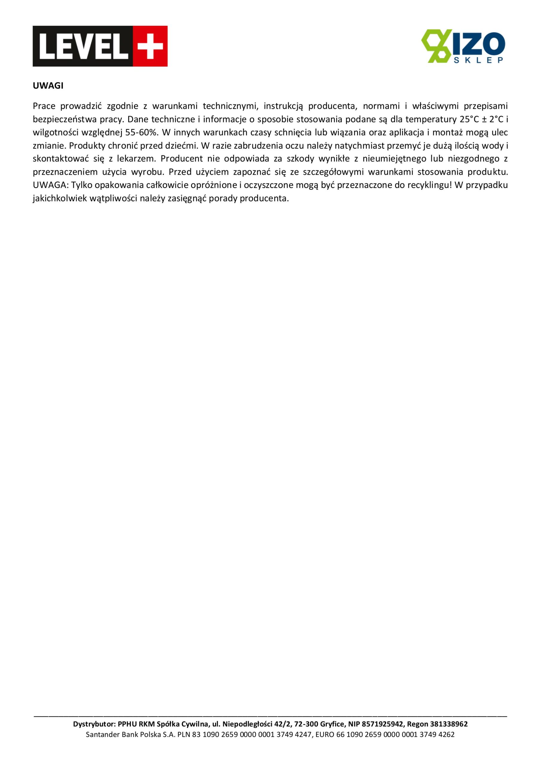 Prace prowadzić zgodnie z warunkami technicznymi, instrukcją producenta, normami i właściwymi przepisami bezpieczeństwa pracy. Dane techniczne i informacje o sposobie stosowania podane są dla temperatury 25°C ± 2°C i wilgotności względnej 55-60%. W innych warunkach czasy schnięcia lub wiązania oraz aplikacja i montaż mogą ulec zmianie. Produkty chronić przed dziećmi. W razie zabrudzenia oczu należy natychmiast przemyć je dużą ilością wody i skontaktować się z lekarzem. Producent nie odpowiada za szkody wynikłe z nieumiejętnego lub niezgodnego z przeznaczeniem użycia wyrobu. Przed użyciem zapoznać się ze szczegółowymi warunkami stosowania produktu. UWAGA: Tylko opakowania całkowicie opróżnione i oczyszczone mogą być przeznaczone do recyklingu! W przypadku jakichkolwiek wątpliwości należy zasięgnąć porady producenta.